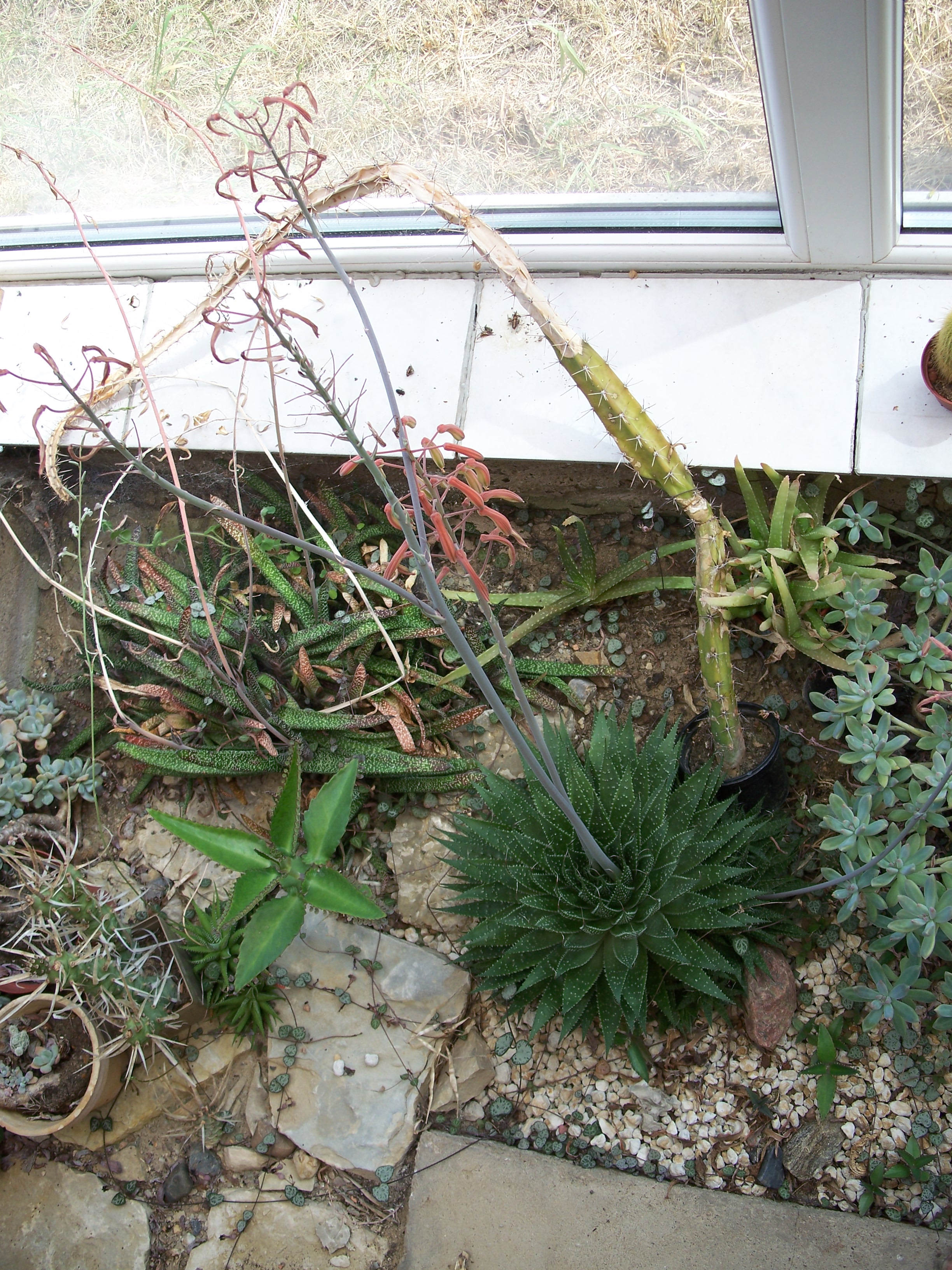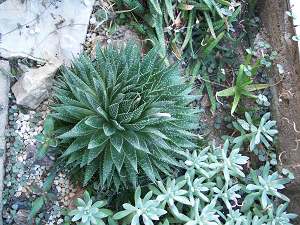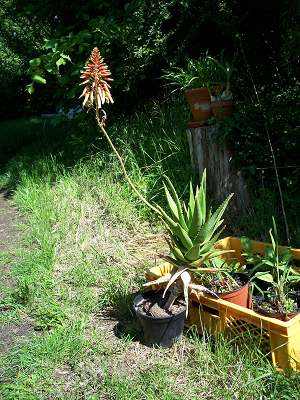 | Diese Aloe aristata ist im Gewächshaus frei ausgepflanzt | und bildet eine stattliche Rosette. | Aloe arborescens kann bei richtiger Pflege auch recht hoch werden. Der kahle Stamm sieht aber nicht sonderlich schön aus, wenn keine Seitentriebe kommen. | Auch Aloe variegata bildet große Gruppen mit zahlreichen Blütenständen. Diese hier müssen noch etwas zulegen. |