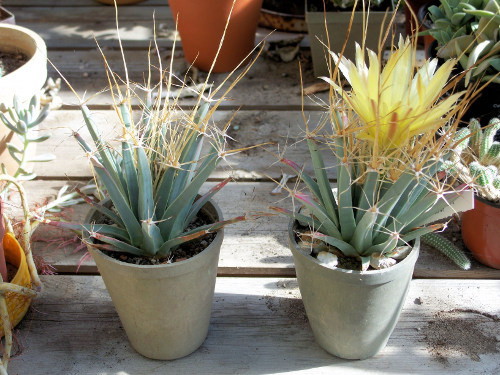 Beide Pflanzen standen beim Einkauf gemeinsam in einem Topf. Seit dem Umpfanzen wird die linke Pflanze ständig unter Glas (Gewächshaus) gehalten. Die rechte Pflanze steht im Sommer im Freiland, bei gleichem Substrat. Die Dornen sind wesentlich kräftiger ausgebildet. Das Haarkleid ist weniger dicht ausgebildet, was auch an der unterschiedlichen Feuchtigkeit liegen kann. Im Gewächshaus gibt es im Gegensatz zur Freilufthaltung keinen Morgentau. Die Anfälligkeit gegen Schädlinge ist im Freien auch geringer, ausgenommen die Schneckenmonster. Die Auswahl der möglichen Standorte ist sehr variabel und auch individuell. Hier sind einige Beispiele.