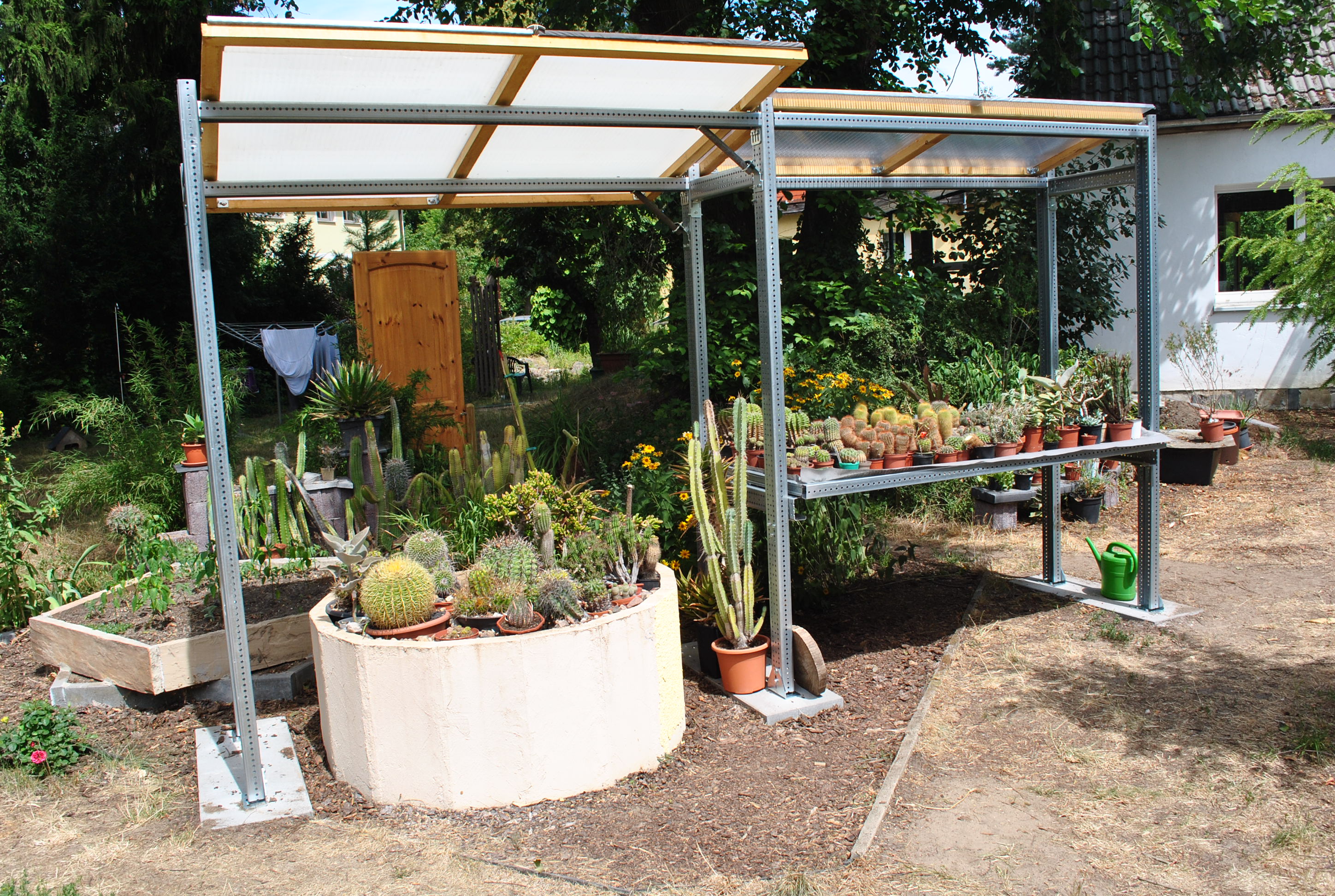 Es gibt durchaus winterharte Pflanzen die mit geigneten Maßnahmen draussen bleiben können. Voraussetzung dafür ein trockener Standort. Wir müssen dabei allerdings beachten, das frosthart nicht gleich winterhart bedeutet. Wir haben hier im Winter oft eine Luftfeuchtigkeit zwischen 50 und 85% wohingegen am Originalstandort oft unter 10% herrschen. In diesem Fall ist das Dach einfach nur herabgesetzt und mit einem Spritzschutz versehen. |