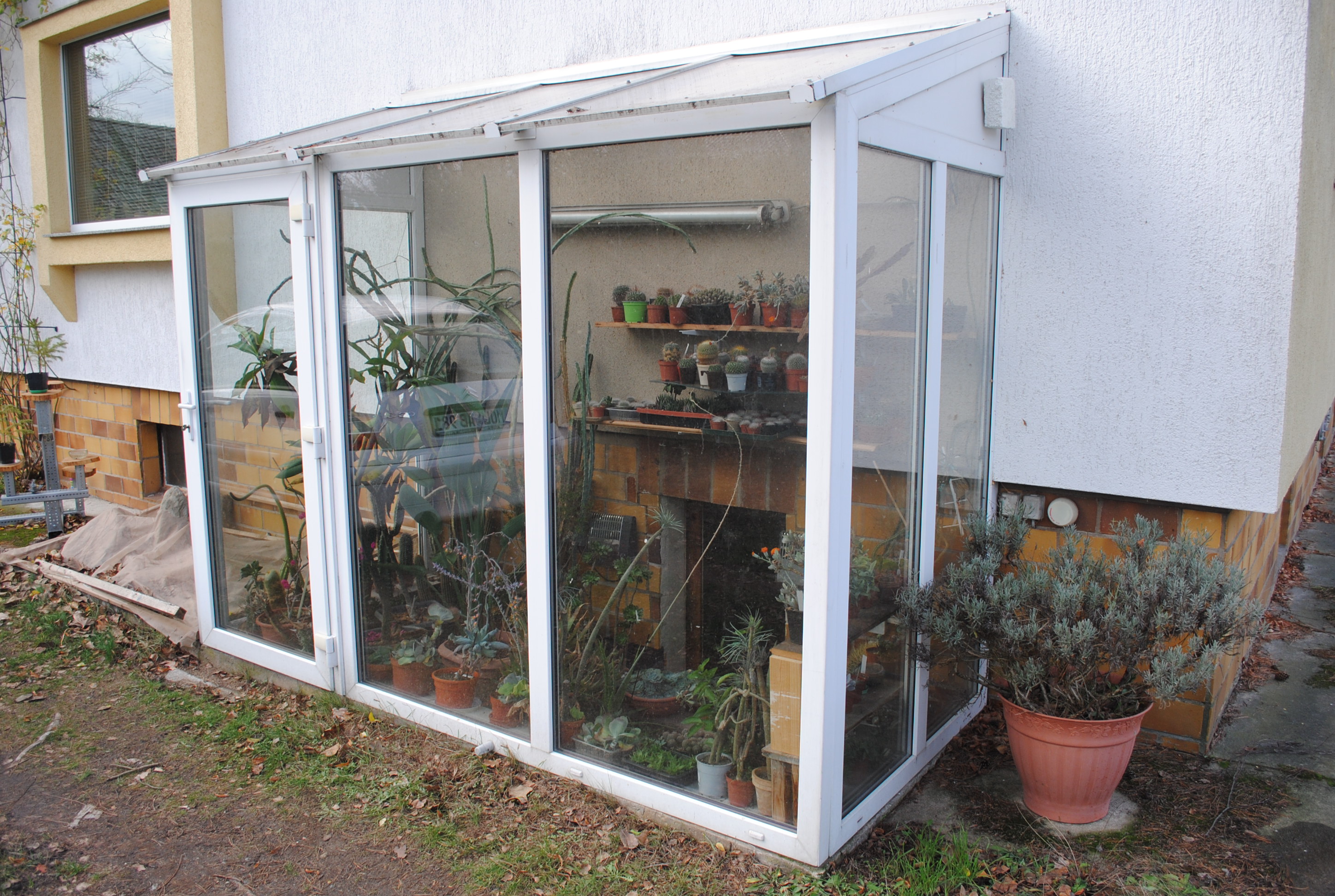 Nur sehr wenige Pflanzen können im Winter ohne Schutz auskommen. Daher ist ein frostfreier, möglichst heller Stand wichtig. Wohl dem der ein Gewächshaus sein eigen nennen kann. Auf diesem Bild sind in Eigenbau ausgediente Hochhausfensterscheiben verarbeitet. Was recht preiswert ist. Es gibt aber der Möglichkeiten viele. |